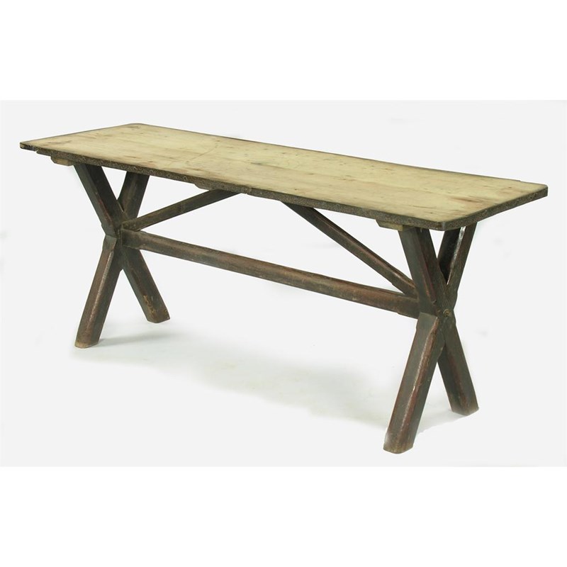A 19th century pine tavern table, the top with a metal band, 28in (71cm) h, 68.5in (174cm) h, 21.5in (54.6cm) d.