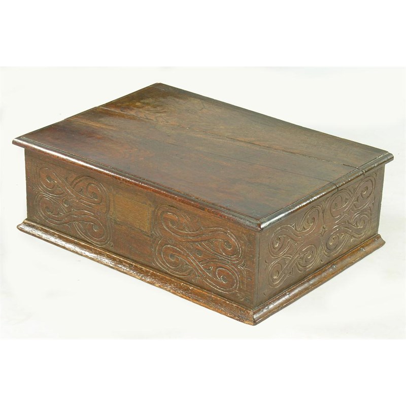 A late 17th century oak boarded box, with carved scroll decoration, 8.5in (21.5cm) h, 25.5in (64.7cm) w, 18.5in (47cm) d. lock missing and recess later filled