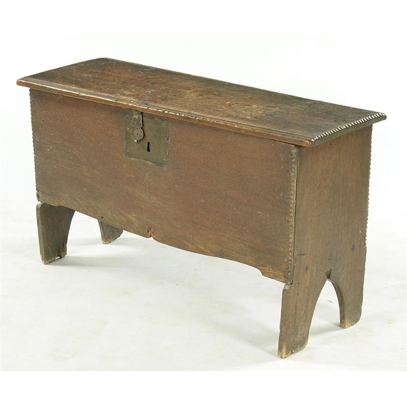 A 17th century oak boarded chest, the moulded edge top branded 'BC' twice, the front shaped apron carved a cross, to shaped cut out ends, 22in (56cm) h, 36.5in (92.6cm) w, 14in (35.6cm) d.