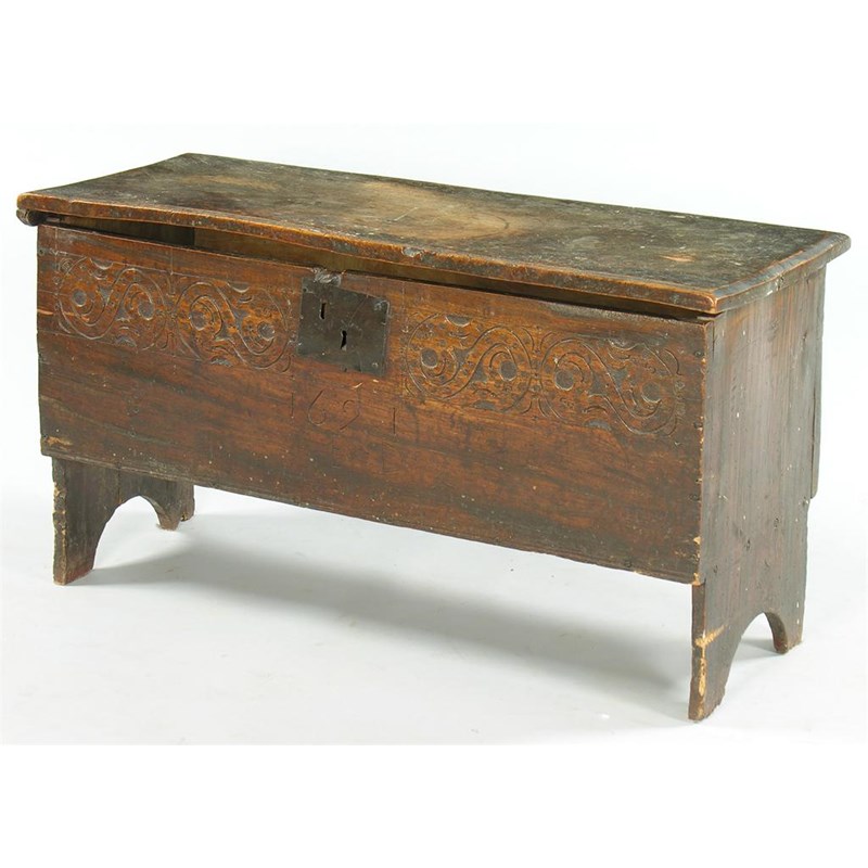 A late 17th century elm boarded chest, the scroll carved banded front, inscribed '1691 over ED', 20.25in (51.3cm) h, 37.5in (95.2cm) w, 14.5in (37cm) d.