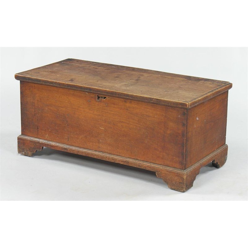 An early 19th century fruitwood boarded chest, the interior with a lidded till, 15in (38cm) h, 34.25in (87cm) w, 16.5in (42cm) d.