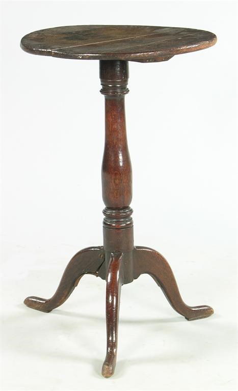 A late 18th century oak tripod table, the fixed top on a turned baluster stem, 28.25in (69cm) h, 18in (45.6cm) dia.
