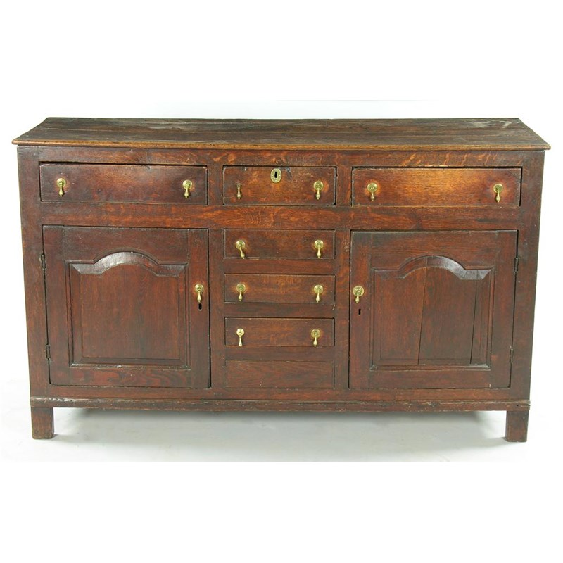 A 19th century oak dresser, the boarded top above three frieze drawers, a central bank of three drawers and a false one flanked by a pair of arch fielded panel doors, 36in (91.4cm) h, 60.25in (153cm) w, 20.5in (52cm) d.