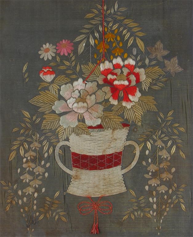 A needlework still life, flowers in a two handled vessel, 20th century, 25.5 x 21in (64.6 x 53.4cm).