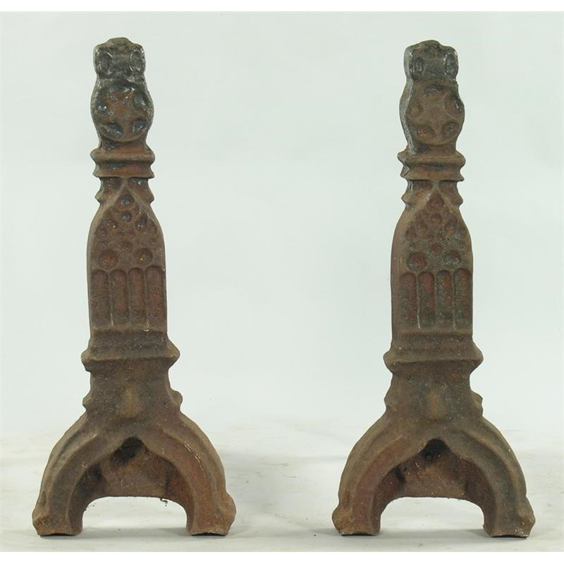 A pair of cast iron Gothic style andirons