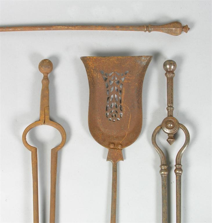 Fourteen steel fire tools, of differing designs with faceted or globe handles, six tongs, four shovels and four pokers, 18th century and later. (14)