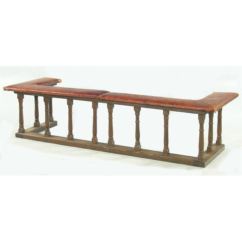 A turned oak and leather seated club fender, in two sections, 20in (50.8cm) h, 79in (200.6cm) w, 25in (63.5cm) d. 62in (157.5cm) w, 16in (40.6cm) d, inside.