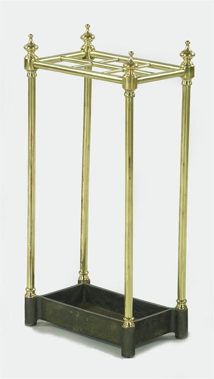 A turned brass six division stick stand, with an iron tray base, early 20th century, 24.5in (62cm) h, 12in (30.5cm) w, 7.5in (19cm) d.