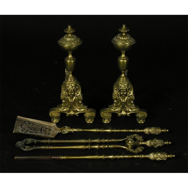 A pair of gilt brass andirons, 16.75in (42.5cm) h, 8in (20.2cm) w, and a set of three late Victorian brass fire irons. (5)