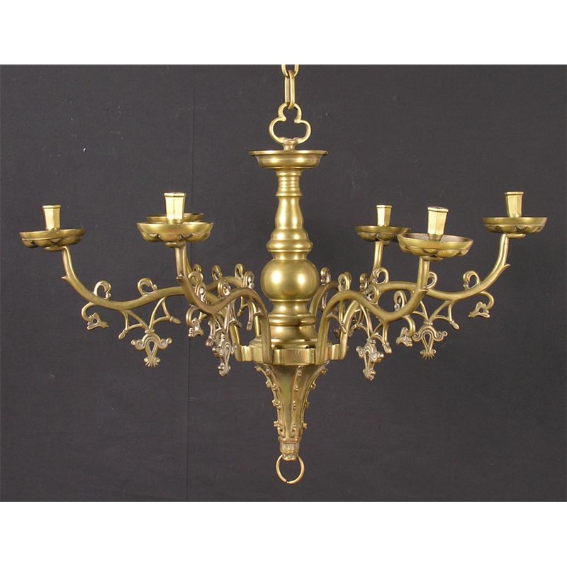 A brass six light chandelier in the Gothic taste, the turned stem to scroll branches with open stylized decoration to lobed drip pans and faceted holders, the crocketed tapering base with an animal head terminal with a ring, 26in (66cm) h, 34.5in (87.5cm) w.