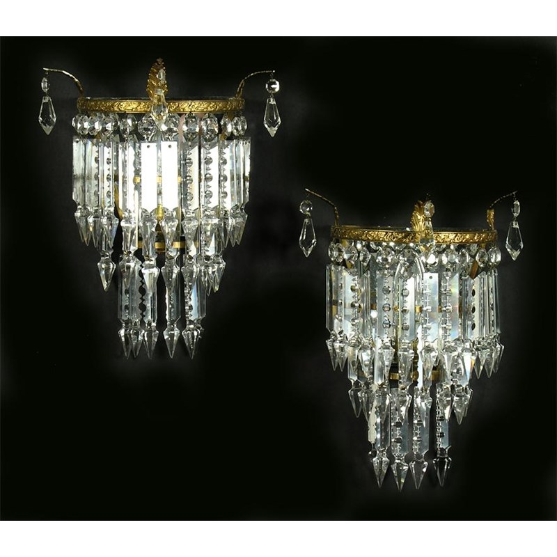 A set of seven gilt brass and cut glass lustre wall lights