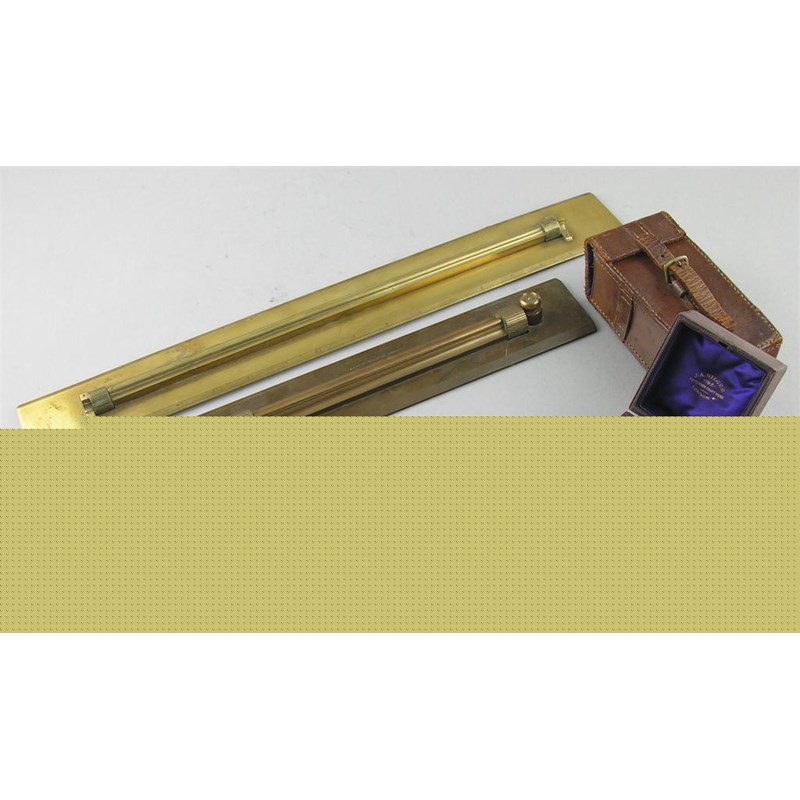A brass and silvered clinometer/compass, by E.R.Watts & Son, 4.75in (12cm) l, in a leather case.