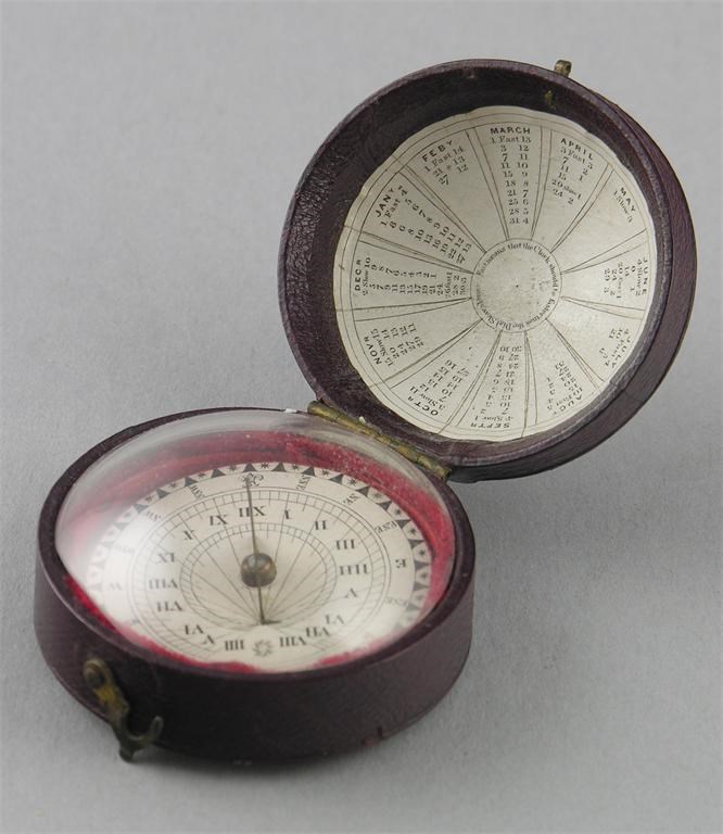 A 19th century sun dial compass, in a leather case, the lid with Fast/Slow calendar, 2in (5cm) dia.
