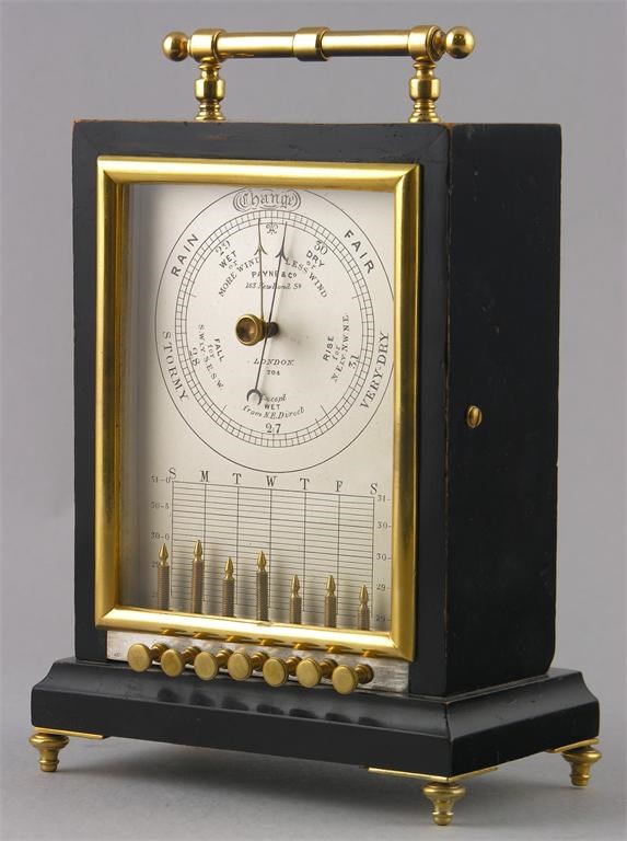 A mid 19th century ebonised and brass mounted display aneroid barometer, the silvered dial inscribed 'Payne & Co, 163 New Bond St, London, 204' above a marked week scale with brass adjusting pointers, 9in (23cm) h, 6in (15cm) w.