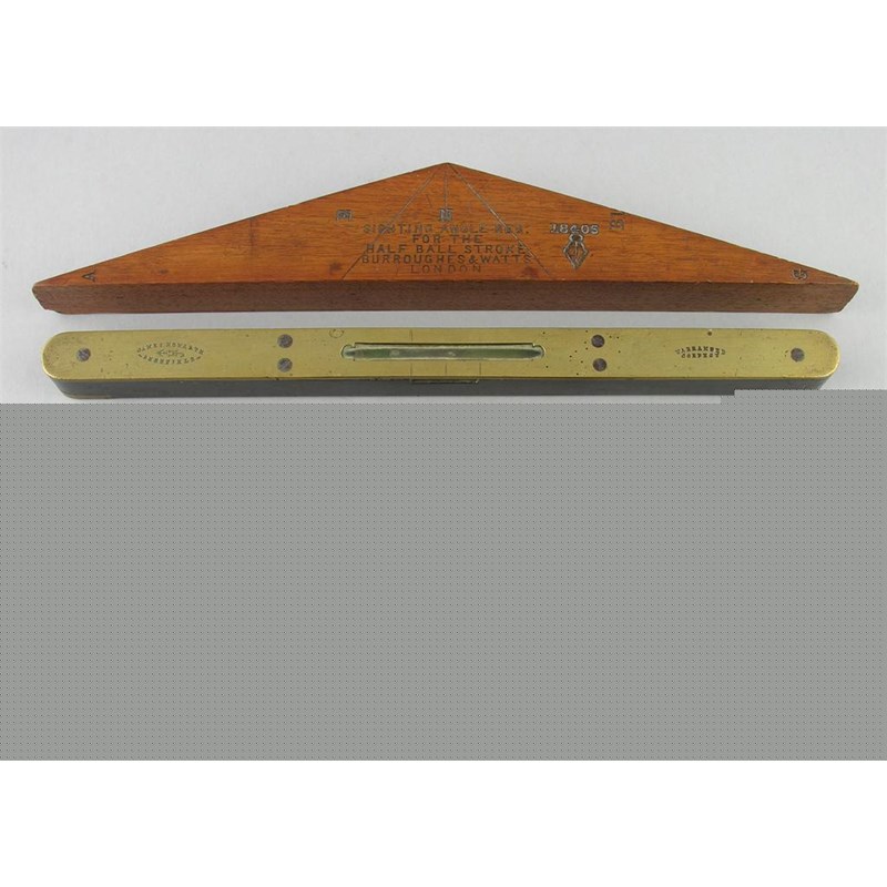 A Burroughes & Watts mahogany 'Sighting Angle For The Half Ball Stroke', Reg 18405, 12.5in (31.7cm) w, a James Howarth, Sheffield brass and ebony spirit level, a brass cased 'Lawn Tennis Measure' 78ft, the front with the correct measurements and a brass and steel tobacco cutter. (4)