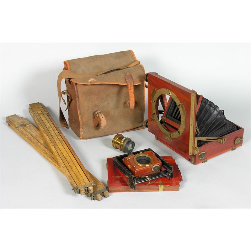 A Thornton Pickard Triple "Imperial" Extension mahogany and brass plate camera, with a Beck Symmetrical Lens, 8in (20.2cm) w. a plate holder, part tripod and a carrying case.