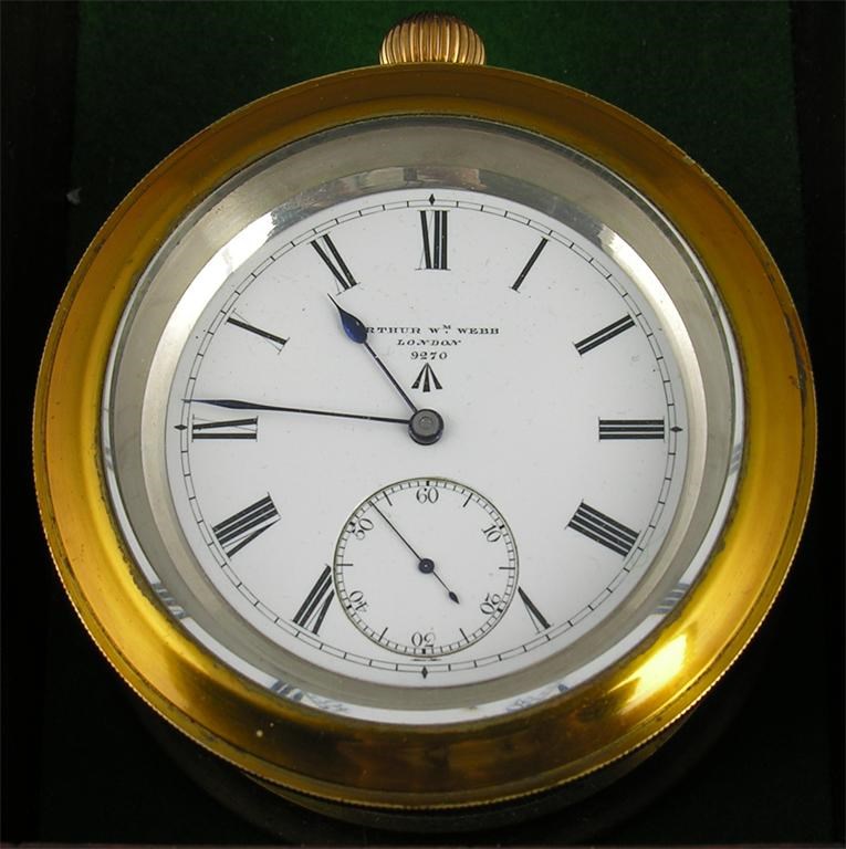 A late Victorian silvered cased deck watch, by Arthur Wm Webb, 90 High Street, Islington, London, No9270, the lever movement with a compensated balance to a white enamel dial with subsidiary seconds dial, hallmarked for London 1892, housed within a brass case and mahogany box, inset an ivory named disc.