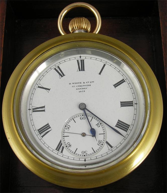 A George V silver cased deck watch, by H White & Co. Ltd, 65 Cheapside, London, No.1939, the lever escapement with compensated balance, the white enamel dial with subsidiary seconds dial, hallmarked for London 1910, housed in a brass case and mahogany box, with named ivory disc.