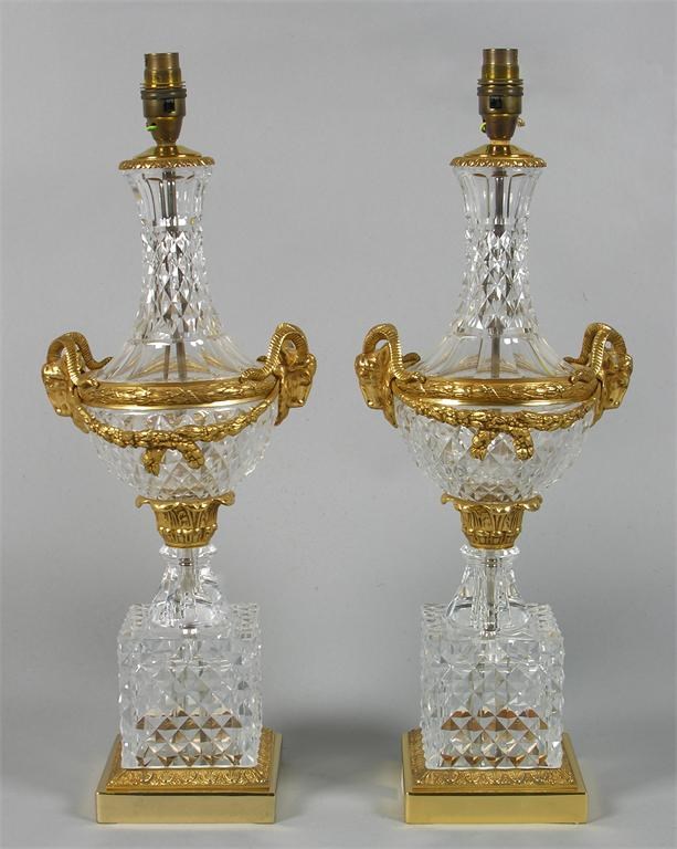 A pair of modern cut glass and ormolu table lamps, with rams' head, laurel and fruiting swag mounts, 21.5in (54.5cm) h. (2)