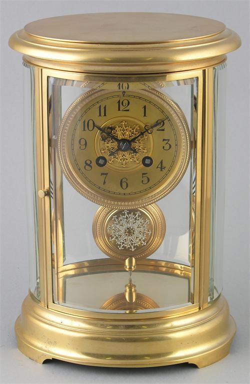 A French gilt brass oval four glass mantel clock, the 8 day movement stamped 'Japy Freres', and striking on a gong, to a brass dial with applied central star, 11in (28cm) h, 7.5in (19cm) w.