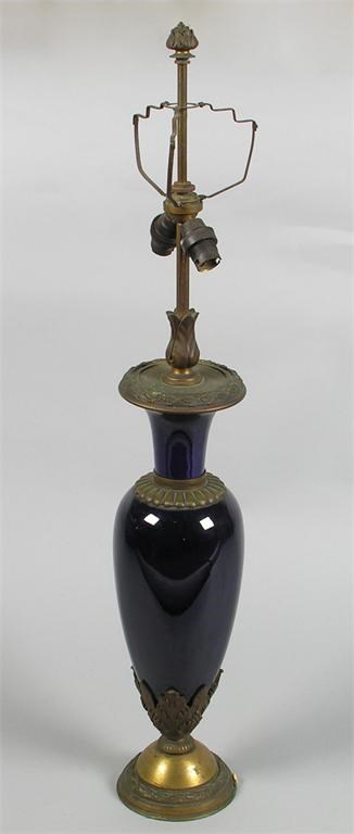 A brass and blue glazed ceramic table lamp, of amphora shape with a bud finial, 34.75in (88cm) h.