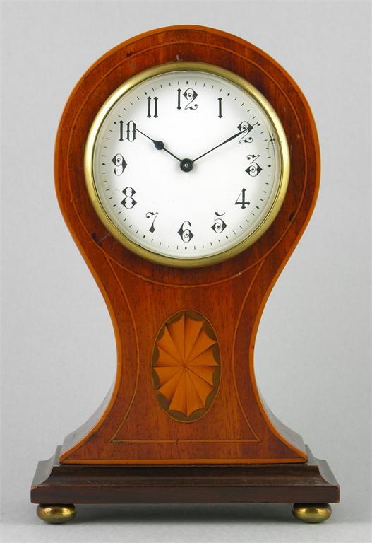 A mahogany and patera inlaid balloon case mantel clock, with a later platform lever escapement to an enamel dial, early 20th century, 9.25in (23.5cm) h,5.75in (14.6cm) w.