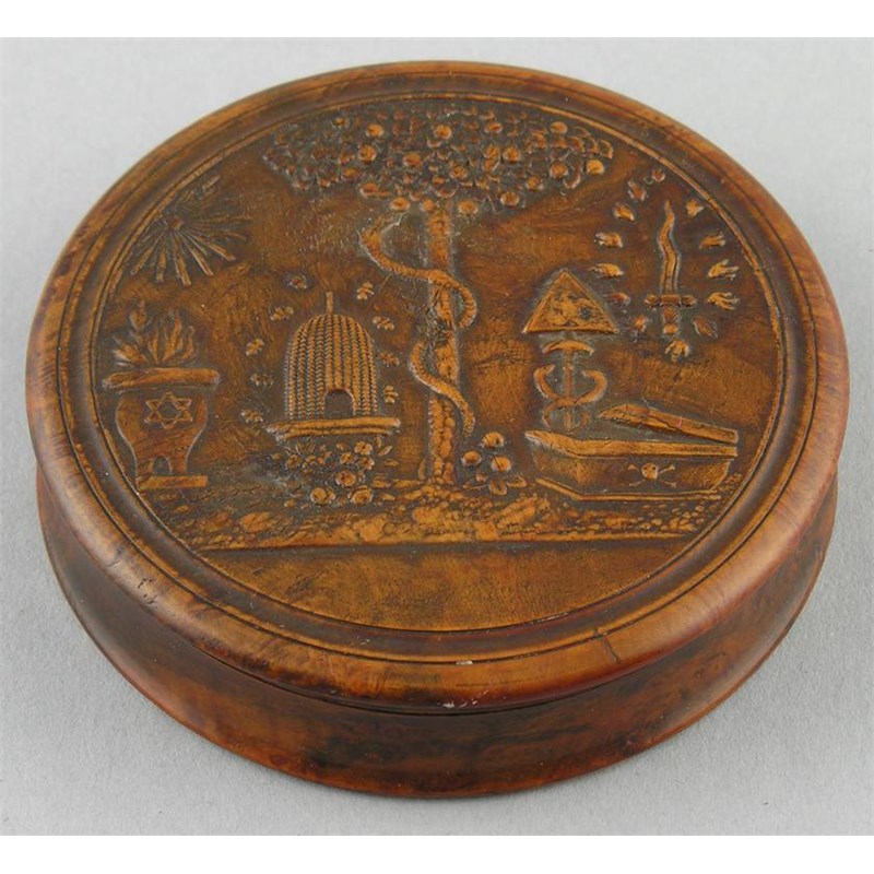 An early 19th century French circular walnut snuff box, the 'pressed' cover depicting Masonic symbols, the interior tortoiseshell lined, 3.25in (8.3cm) d. See Evan-Thomas, Owen. Domestic Utensils of Wood. Plate 41 for a similar example.