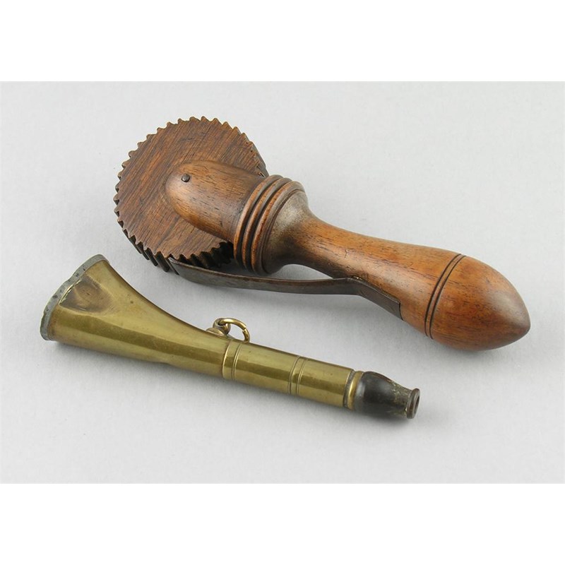 A turned treen and iron bird scarer, 7.5in (19vm) l, and a brass beater's horn, with turned horn mouth piece. (2)