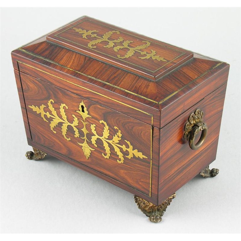 A George IV rosewood and brass marquetry inlaid tea caddy, the interior with two lidded compartments, 6.5in (16.5cm) h, 8in (20.3cm) w, 4.75in (12cm) d.