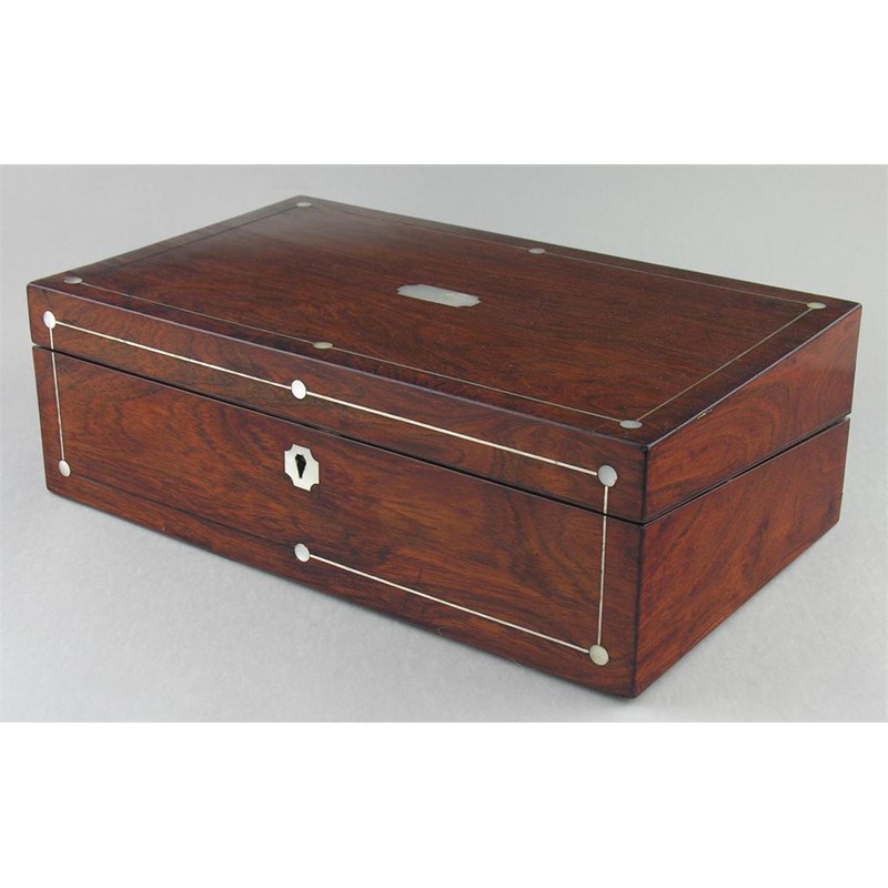 An early Victorian rosewood writing slope, inlaid pewter stringing and mother-of-pearl, the fitted interior with three secret drawers and one glass ink bottle, 5in (12.6cm) h, 16in (40.6cm) w, 9.5in (24cm) d.