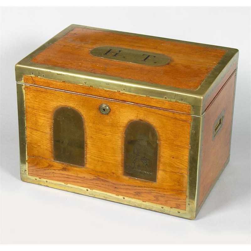 A Victorian oak and brass bound travelling tantalus, the hinged cover inset a plaque enamelled 'H.T.' the front with engraved panels depicting soldiers, the interior with six square cut glass decanters with stoppers, the lock stamped 'Bramah London', sunken side carrying handles, 12in (20.5cm) h, 17in (43.2cm) w, 11.75in (29.8cm) d. One decanter cracked.