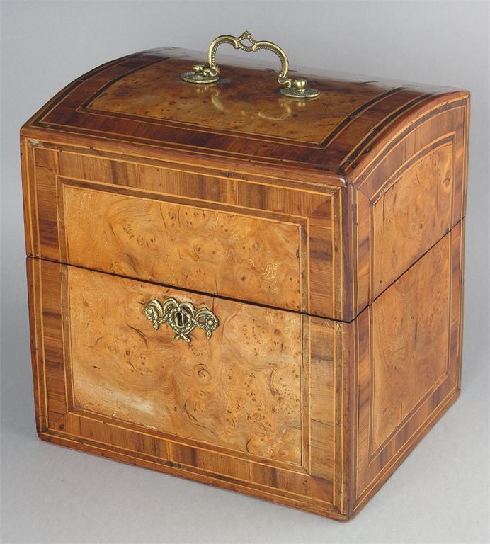 A stationery box with domed cover, veneered in burr elm with yew banding and stringing, with a divided interior, 10.75in (27.3cm) h, 10in (25.4cm) w, 8.25in (21cm) d.