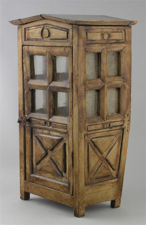 A French miniature painted wood sedan chair, with glazed panels and a hinged door to a fabric lined interior, 20.75in (53.6cm) h, 11.5in (29cm) w, 9in (23cm) d.