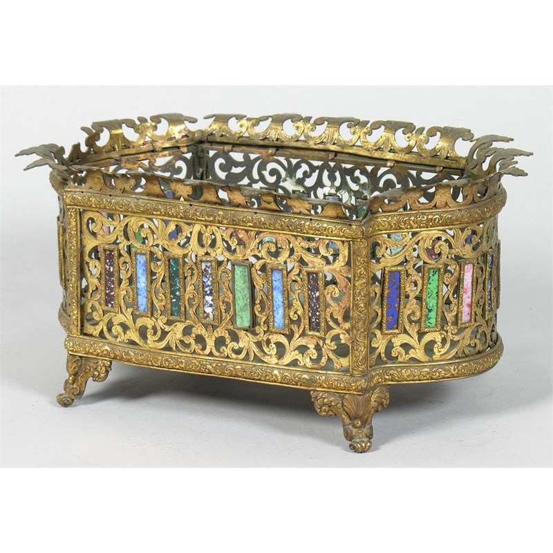 An early 19th century engraved, chased and pierced gilt brass oblong jardiniere, mounted Venetian glass panels, 5.5in (14cm) h, 12.5in (31.8cm) w, 8in (20.2cm) d.