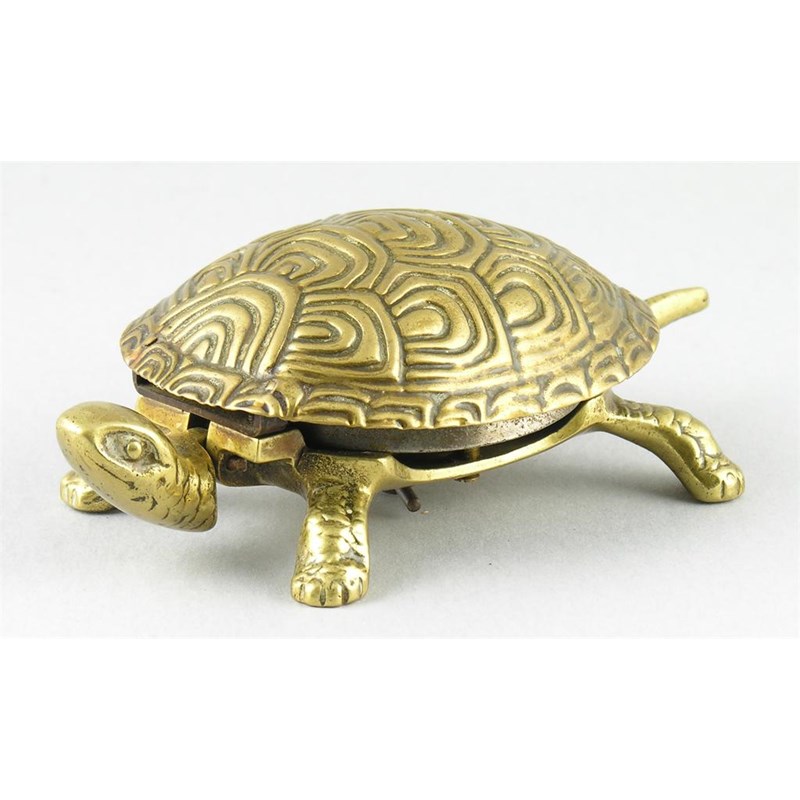 A brass 'turtle' counter bell, the wind-up spring activated by pressing the head or tail, 2.25in (5.7cm) h, 6.75in (17cm) l.