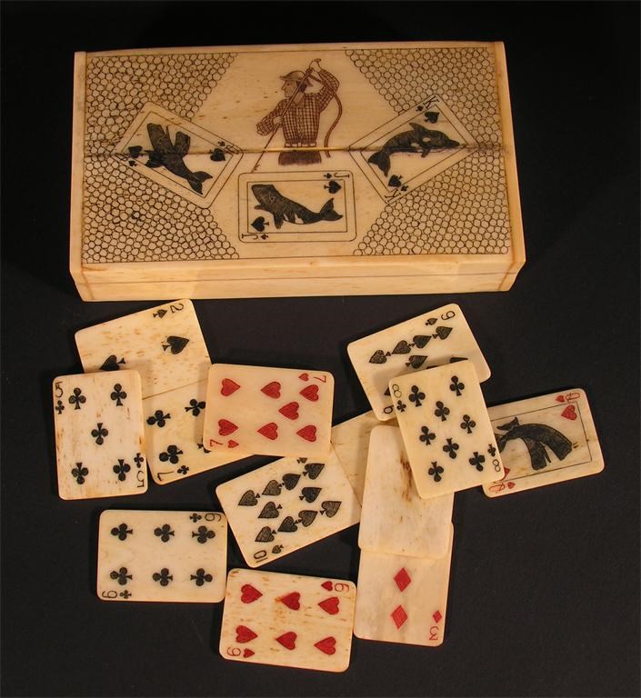A set of lacquered bone 'Whaling' cards, including two Jokers, the Royal cards depicting differing aquatic mammals, the box inscribed to the verso, 4.25in (10.8cm) w, 2.25in (6cm) d.