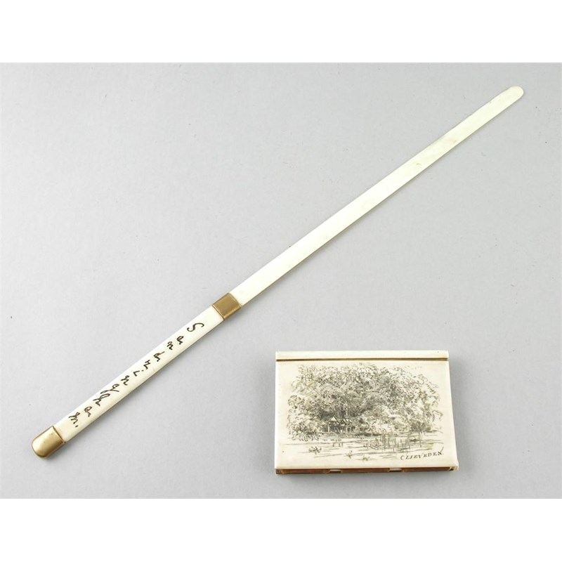 A Victorian ivory and brass mounted letter opener, engraved 'Sandringham Christmas 1877,' 17.25in (437cm) l, and an ivory hinged card case, engraved a river scene 'Clieveden'. (2)