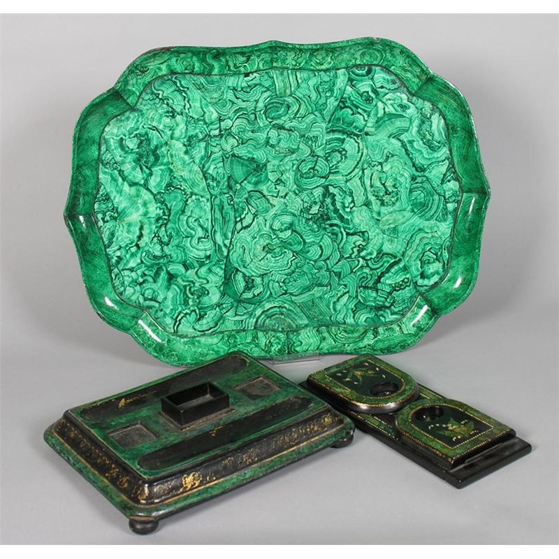 A papier-mache 'malachite' decorated tray, stamped 'JENNENS & BETTRIDGES MAKER LONDON,' 25in (63.5cm) w, an adjustable book stand and a desk stand, missing wells and cover. (3)