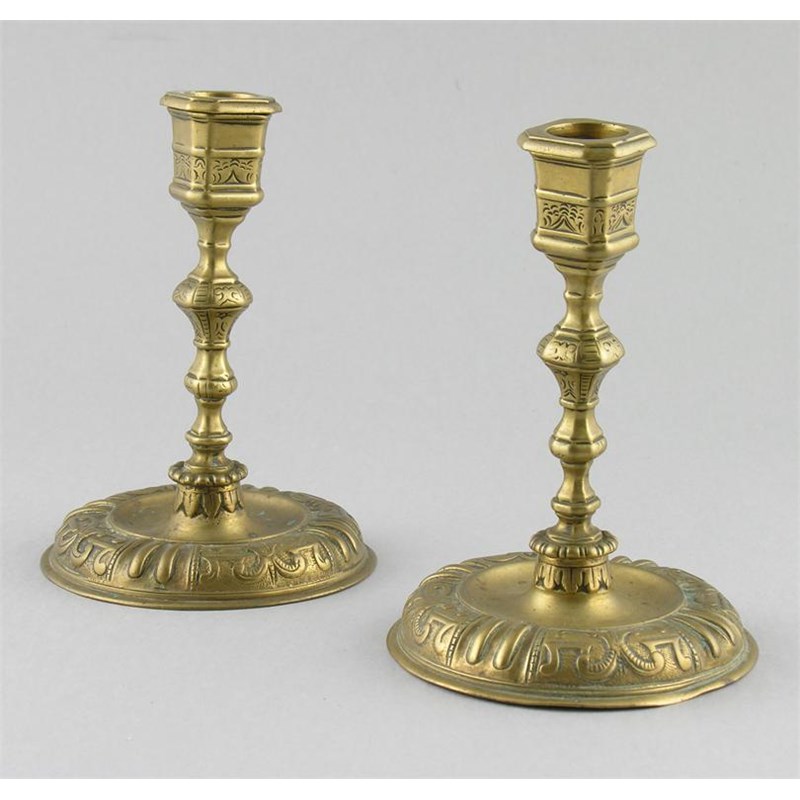 A pair of 18th century style brass candlesticks, with engraved and chased decoration, having detachable nozzles, one base stamped 'LR 37' worn, 6.25in (16cm) h. (2)