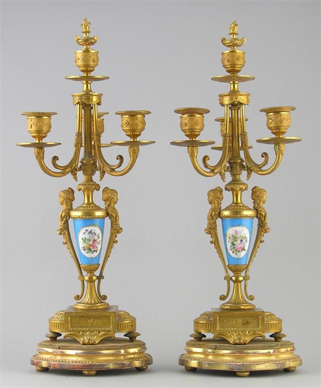 A pair of late 19th century French porcelain and gilt spelter three branch candelabra, stamped 'Ph Mourey', 18un (45.6cm) h, on giltwood stands. (4)