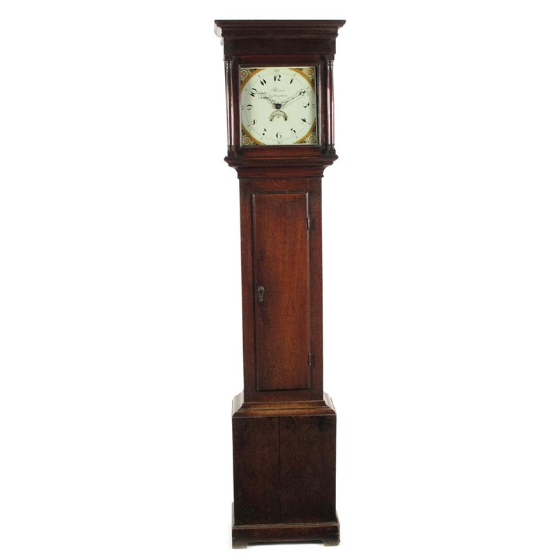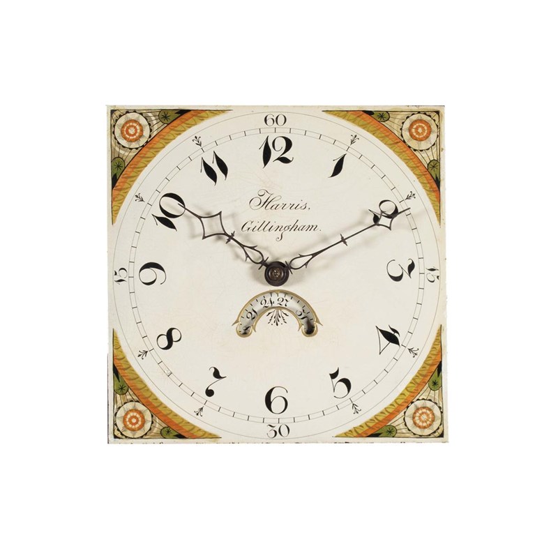 An oak longcase clock, the 30 hour movement striking on a bell, with a 11 inch painted square dial with pierced crescent date aperture signed Harris, Gillingham, the hood with fruitwood pilasters, 78.25in (198.5cm) h.
