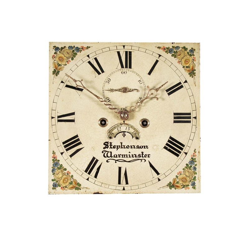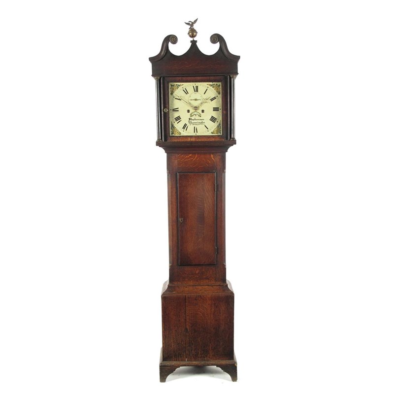 A 19th century oak longcase clock, with an 8 day movement striking on a bell, with a painted and printed 12 inch square dial, with subsidiary seconds dial and crescent shape date aperture signed Stephenson, Warminster, 84.5in (212cm) h.