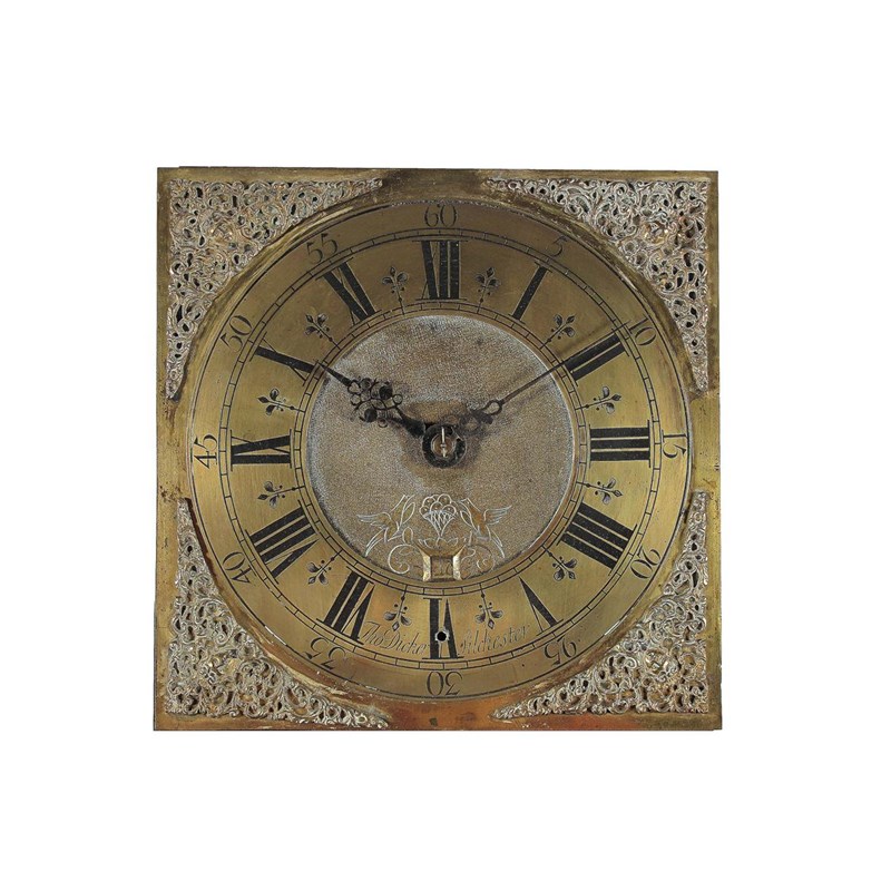 An oak 30 hour longcase clock, striking on a bell with a 11inch square brass dial, the chapter ring signed Tho Dicker, Silchester, the matt centre with a square date aperture, engraved birds and fruit, 79.25in (201.5cm) h.