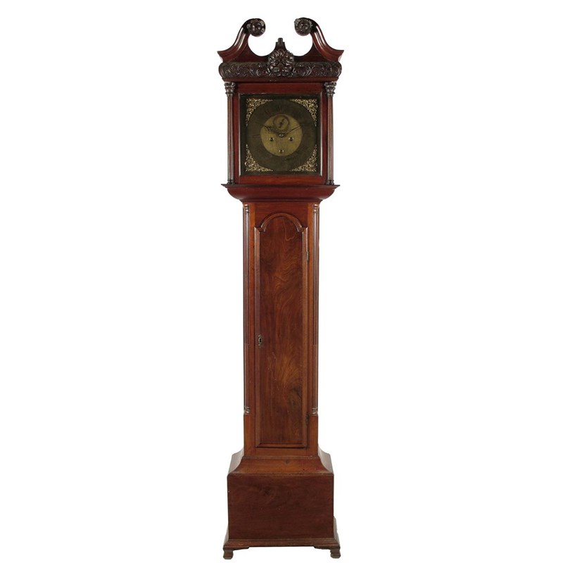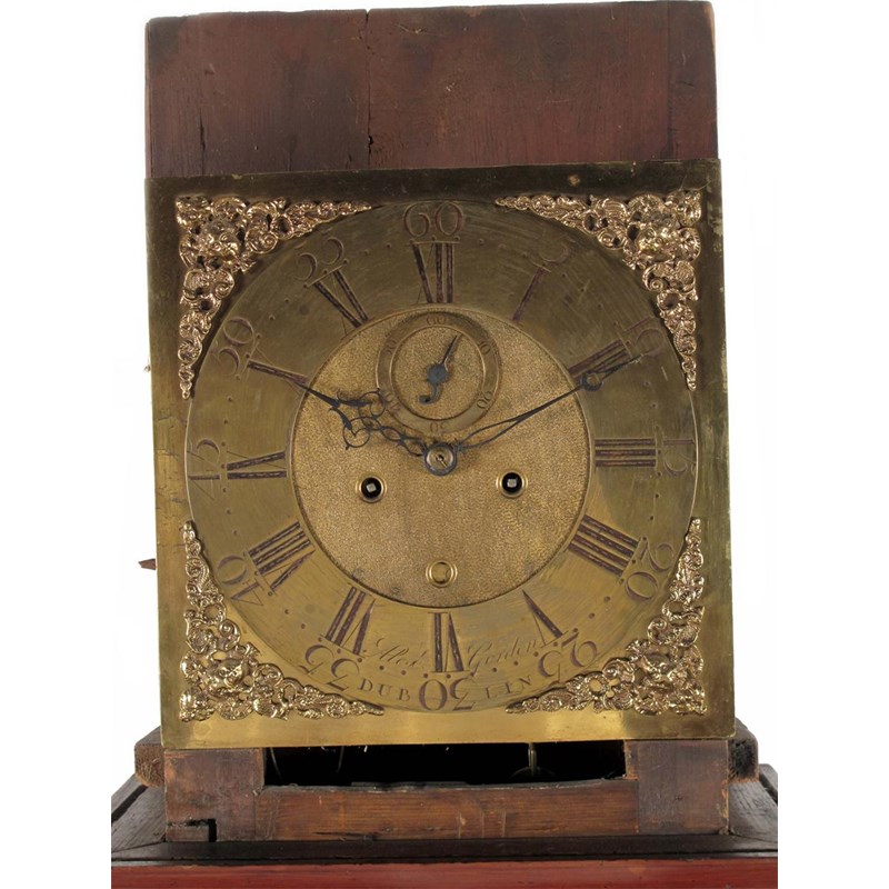 An Irish mahogany longcase clock, with an 8 day movement striking on a bell and a 13inch square brass dial, the chapter ring signed Alexr Gordon, Dublin, subsidiary seconds dial and circular date aperture, winged mask spandrels, the hood with a swan neck pediment with carved rosettes above a foliage carved frieze centred a lion mask, corinthian capital pilasters, broken arch trunk door flanked by reeded quarter pilasters, the base on ogee bracket feet, 92.75in (235.5cm) h.