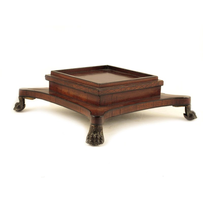 A Regency mahogany clock stand, with stringing to a square raised platform and a quatreform base to gilt brass hairy paw feet, 3.75in (9.5cm) h, 11.75in (30cm) w, top aperture 6in (15cm) sq.