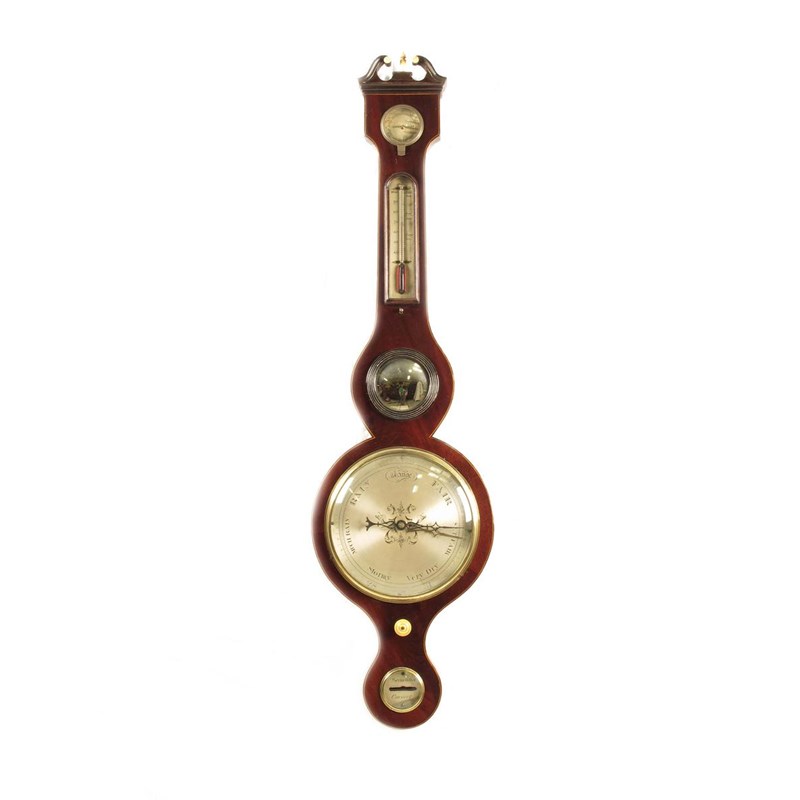 A 19th century mahogany banjo barometer, with a swan neck pediment and ivory mounts, to a hygrometer and thermometer above a convex mirror with ebonised reeded frame, the main 8 inch dial above a level, the dial inscribed Warranted Correct, the case with ebony and boxwood stringing, 38.5in (98cm) h.