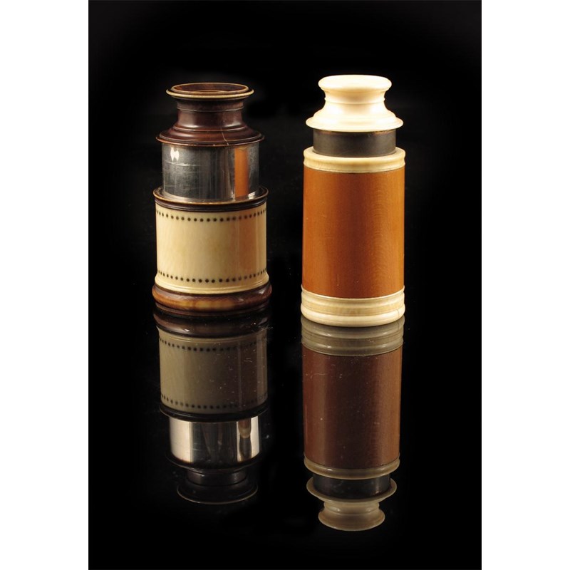 An early 19th century ivory and fruitwood spyglass, the brass tube signed Jones, Holborn, London, 5in (13cm) h, and an ivory and stained spyglass, with a silver coloured metal tube, the body with pique dot bands, 4in (10cm.) (2)