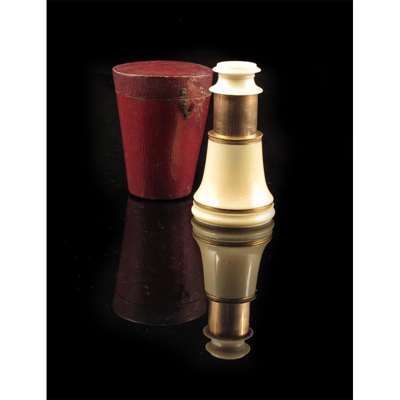 An early 19th century gilt brass and ivory single drawer spyglass, 3.5in (9cm) l, open, in a fitted red leather case. (2)