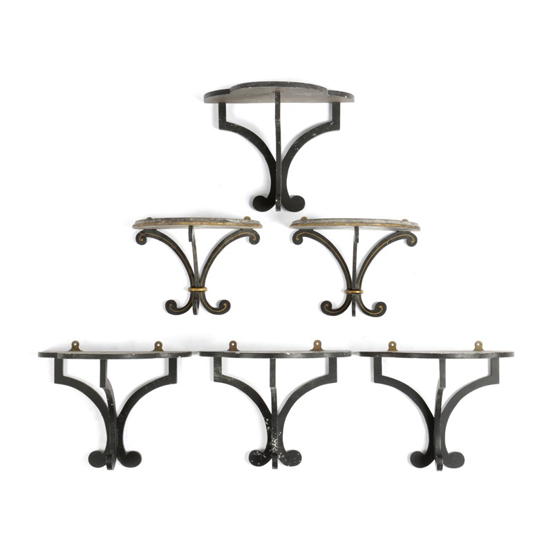 each with a trefoil top above inturned scroll supports, together with another pair of ebonised wall brackets with yellow detail (6)