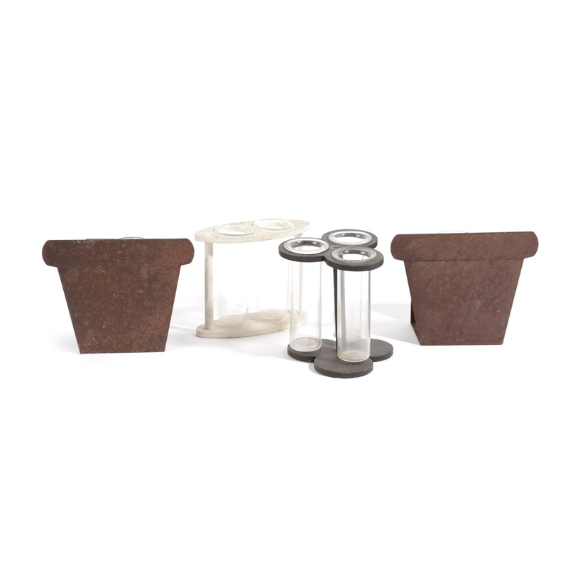 together with a white Compton oval flower holder and a pair of metal, wall mounted 'flower pot' flower holders, each with glass liners (4)